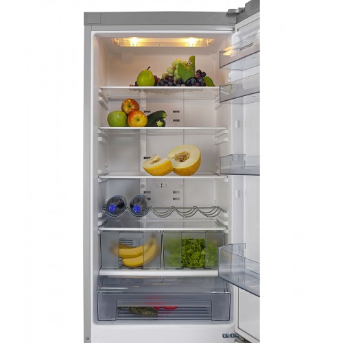В данной модели также предусмотрена система NO FROST, низкий А класс энергопотребления и зона свежести, которая позволяет поддерживать постоянный уровень влажности для оптимального хранения свежих овощей и фруктов. Стильный цвет корпуса - серебристый позволит вписаться холодильнику даже в самую современную кухню.