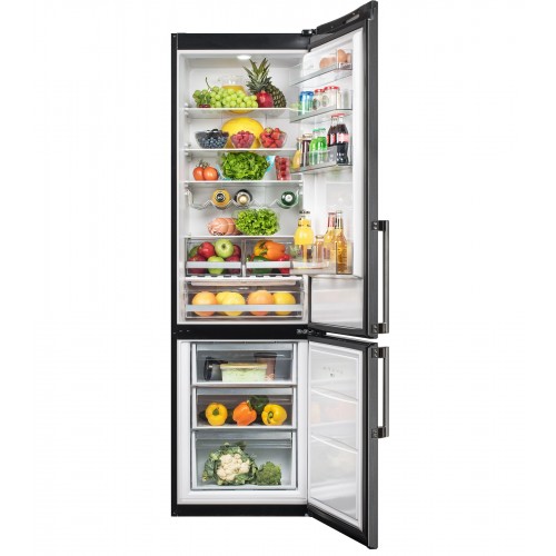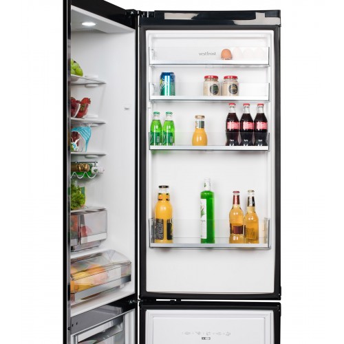 Ширина всего 59,5 см, высота 202,2 см, глубина 63,2 см. Внутри установлены 4 полки из закаленного стекла, каждая полка рассчитана на нагрузку до 35 кг. Внизу зона свежести Fresh Zone на телескопических направляющих. Мясо, рыба, зелень, фрукты и овощи могут храниться здесь в несколько раз дольше, достигается это благодаря поддержанию нулевой температуры и высокого уровня влажности. Над зоной свежести расположены два больших ящика для овощей и фруктов, в которых легко поместится недельный запас продуктов. В овощных ящиках также возможна регулировка влажности (регулируется впуск воздуха в ящик для фруктов и овощей, и продукты дольше остаются свежими).
