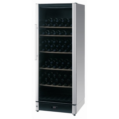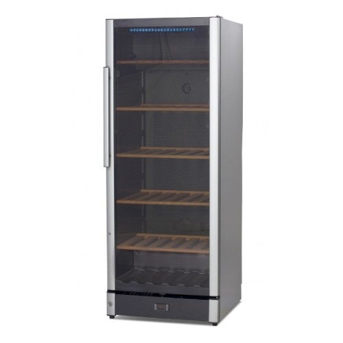 Данная модель вмещает до 90 бутылок вина (0,75 л), которые могут располагаться на пяти подвижных деревянных полках из ценных пород дерева, а также полке в основании шкафа. В этом винном шкафе подобранна оптимальная температура хранения вина (+5 до +22 C°), а двойное тонированное стекло надежно защитит от губительного для вина УФ излучения. Так же в данной модели есть угольный фильтр, очищающий воздух внутри шкафа. Винный шкаф идеально впишется в любое помещение, так как у него есть возможность перевешивания дверей.